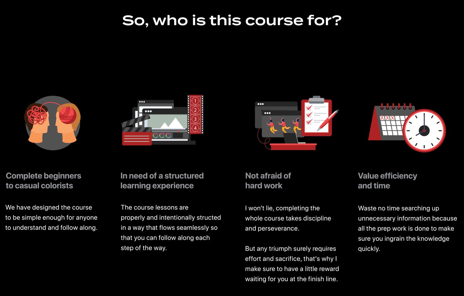 Great question! There are many sites with free resources to help you learn colour grading, if you’re on a tight budget, that’s a great place to start! But if you value your time and prefer a concise learning experience, then this course is for you. It covers everything you’d need to know to grade beautifully and professionally so you won’t hit any snags in the future. I will also share my techniques and decision-making process which is up-to-date with the latest colour grading knowledge – THAT you can’t find anywhere else.